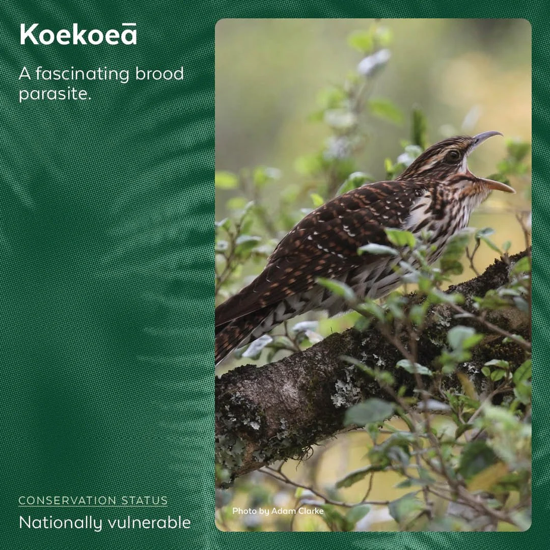 Like all cuckoos they are brood parasites, meaning that they lay eggs in the nest of a host species that will raise their chicks. Host species for the koekoeā include white head, yellow head, and brown creeper. Because Waiheke is not home to any of their host species they do not breed on the island but have been seen visiting or seen flying over.