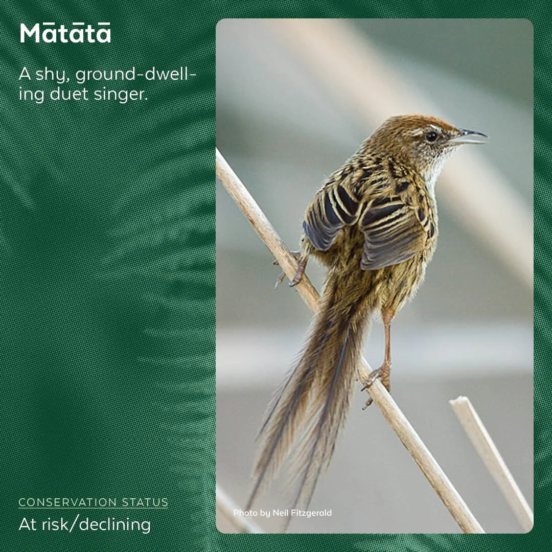 The mātātā is a small brown bird with a scruffy tail which lives in wetlands and scrub. It was once widespread across the country but now only remains in small pockets of its former range. Their camouflage and shy nature means that they are not often seen but can be heard. Pairs perform duets, each partner waiting for the other to reply.