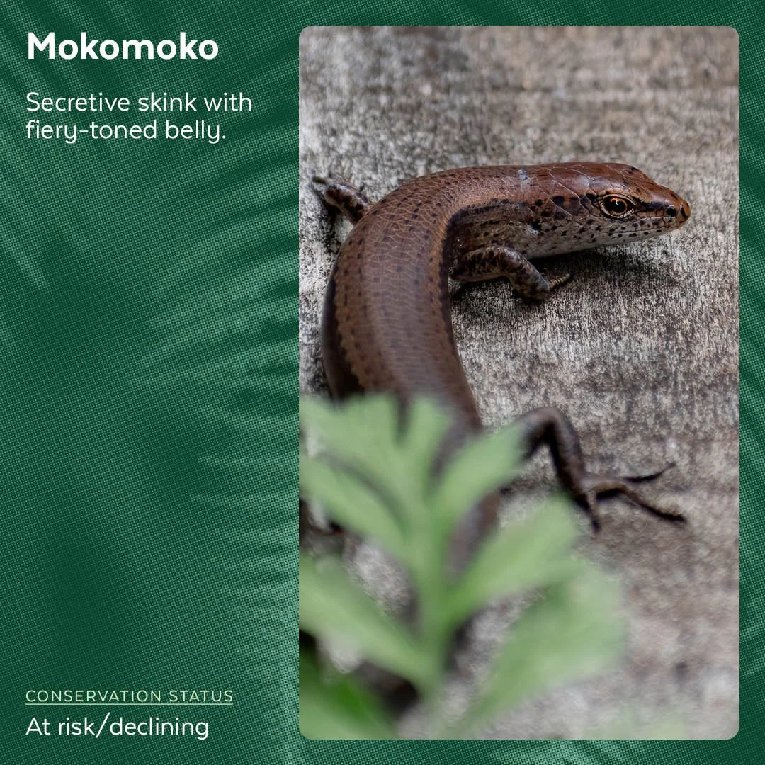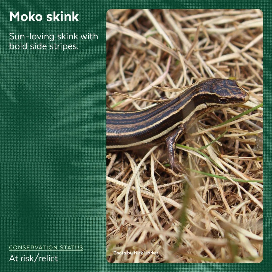 The moko skink is omnivorous, feeding on berries, invertebrates and even introduced plague skinks! Their preferred habitat is rank grass or coastal forest underneath coastal rocks and logs. As with most of our native skinks, females give birth to live young and will produce 1 to 6 offspring per year.