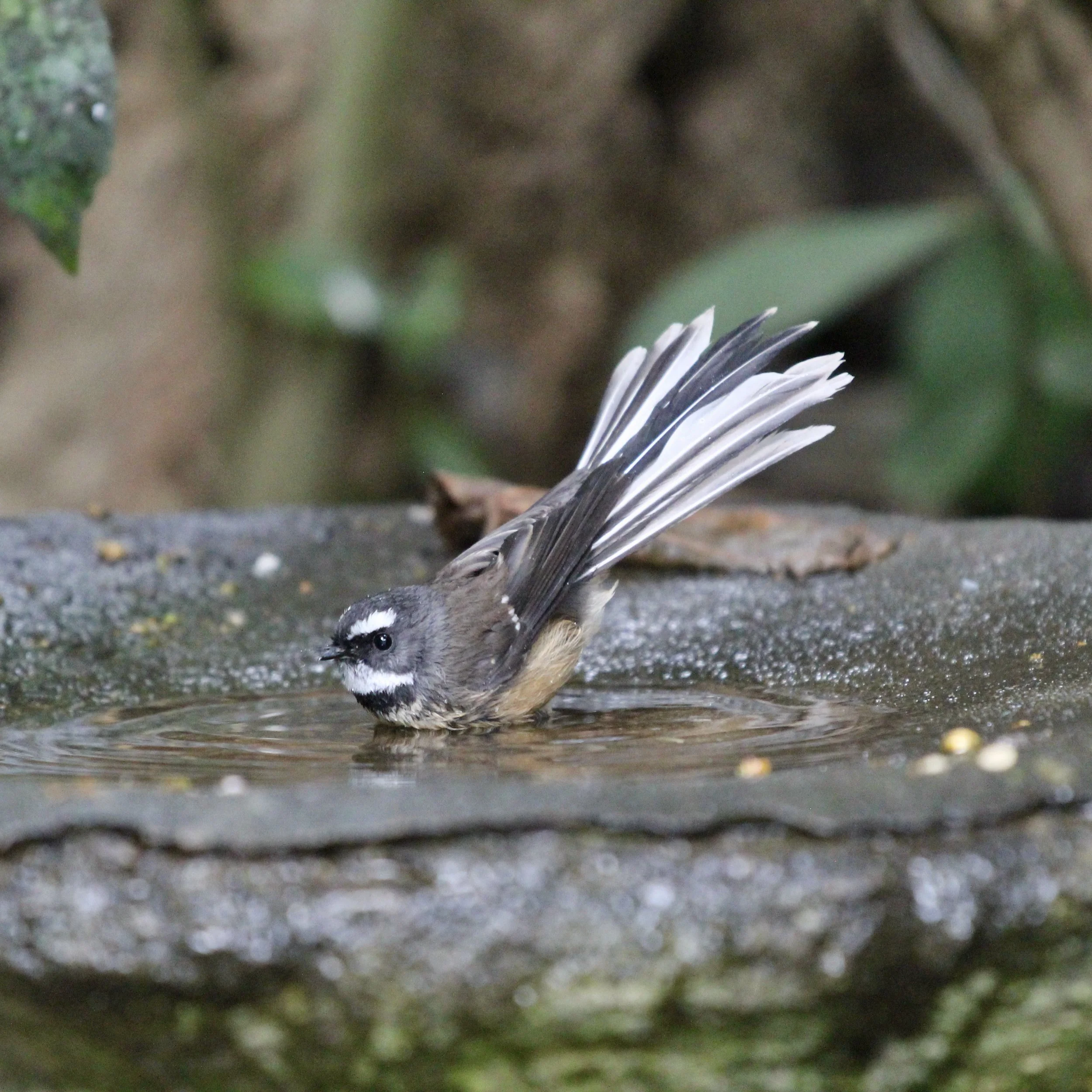 I find a spot near a water dish made of stone and watch as a pair splash each other, darting between the kawakawa and shallow water. Rather than stepping, they hop joyfully with both tiny feet. They bounce around as the water runs off them, for once not chasing bugs, but each other, delighting in the cool water. Their chatter continues as I walk away and for a moment I think I may not be accompanied for the walk home but sure enough, one is suddenly there, looking curiously from a branch, already eyeing the insects at my feet.