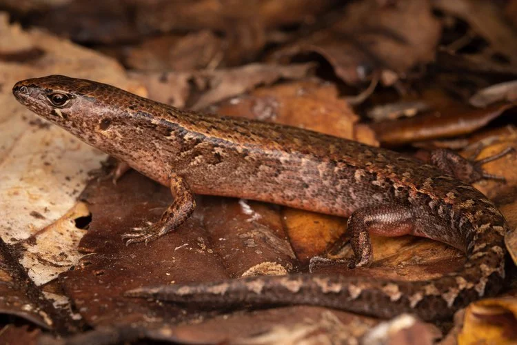 The world seems unmoving around her, just how she likes it. She scampers up onto the rock. While invisible in the leaf litter, her brown scales stand out against the dry stones. Two dark tear-drop scales frame her amber-coloured eyes, the gentle thump of her breathing visible just behind her elbows. The warmth seeps into her cool blood as she stretches out to bask.