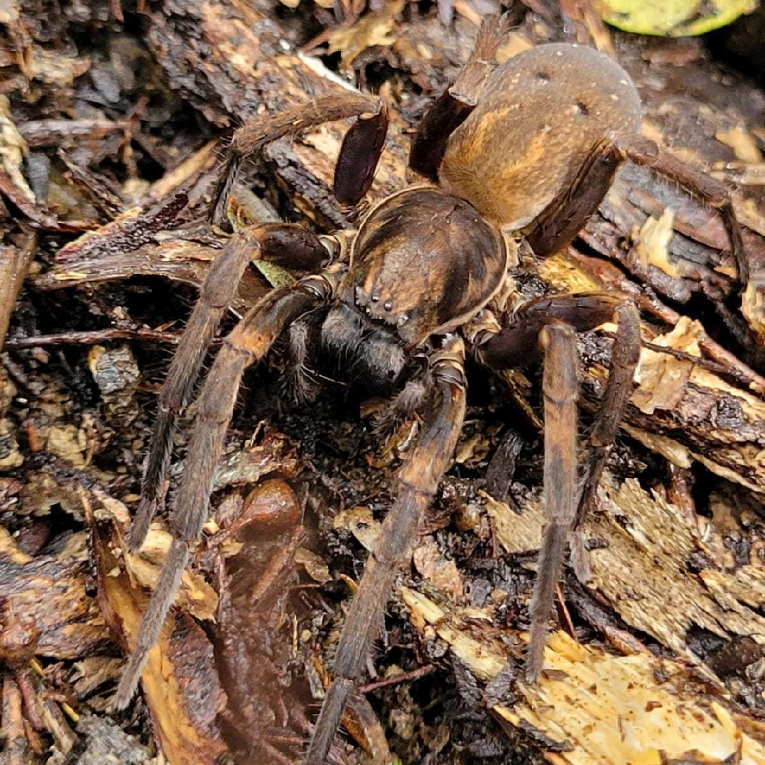 This was tested when I shifted one of our traps and was very quickly confronted by a large, grumpy, brown spider with her eyes fixed directly on me. She was not pleased that I’d disturbed her home, which is fair enough I reckon. A quick iNat search found that she was a vagrant spider. Her dark abdomen was speckled with light spots and stripes, a camouflage so successful I struggled to find her again on the forest floor after looking away for only a second.