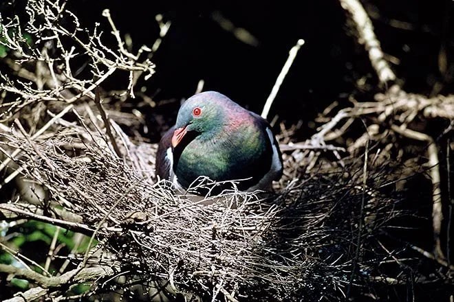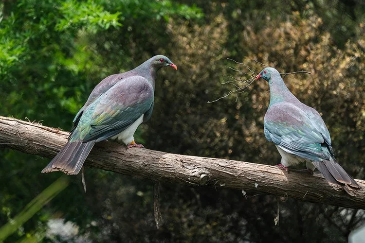 Along with the aerial displays above, birds are busy below foraging for sticks, leaves and mosses to construct nests to house their young. Each bird species prefers different locations, materials and styles. Kererū are makers of messy nests made of twigs high in the trees, while pīwakakwaka (fantails) create delicate wee nests made from mosses, dried rotten wood fibres, dried grasses and fern scales. Other birds such as the kākāriki (red-crowned parakeet) and kākā abandon the notion of nest building from scratch instead choosing to retrofit tree cavities into their family home.