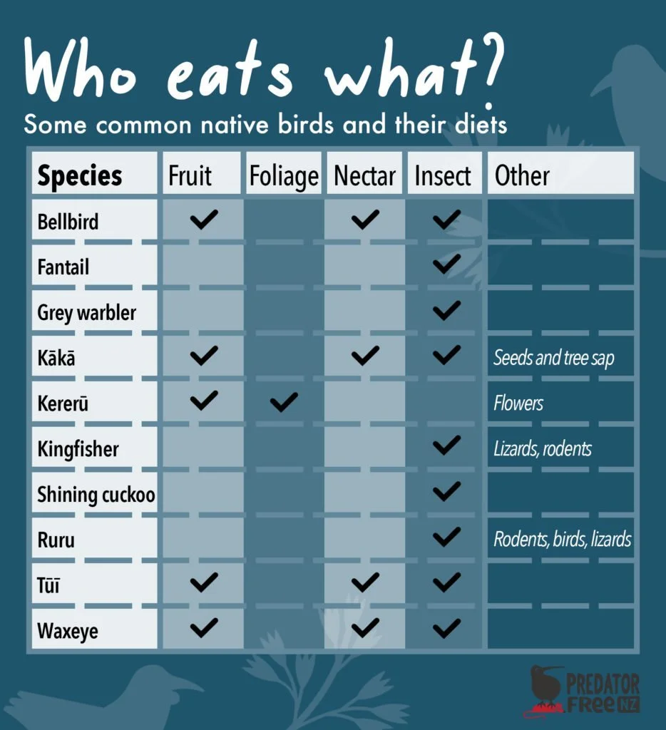 But what about the recent return of native species to the island? As stoat numbers drop, kākā number have soared across the motu, but they aren’t the only returnees. Sightings of kākāriki and korimako are becoming far more frequent, so what kind of food do they eat?
