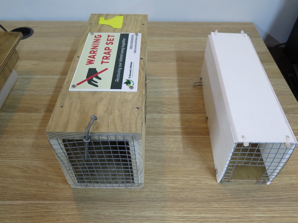 Wooden trap boxes like these are a popular choice in Aotearoa, New Zealand, though they do come with limitations. The wooden design weighs around three times that of the corflute trap so it's not as versatile, but it is much stronger. We based this design on one used by Predator Free Mt Cook, and put our own spin on it, changing the door mechanism slightly to better access the trap inside.
