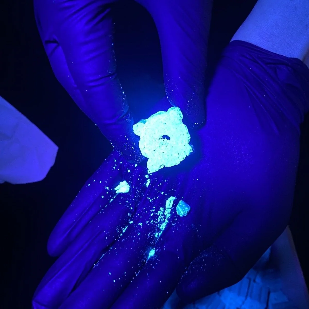 Turn off the lights and switch on a UV light and this is what the rat bait in the operational trials looks like.