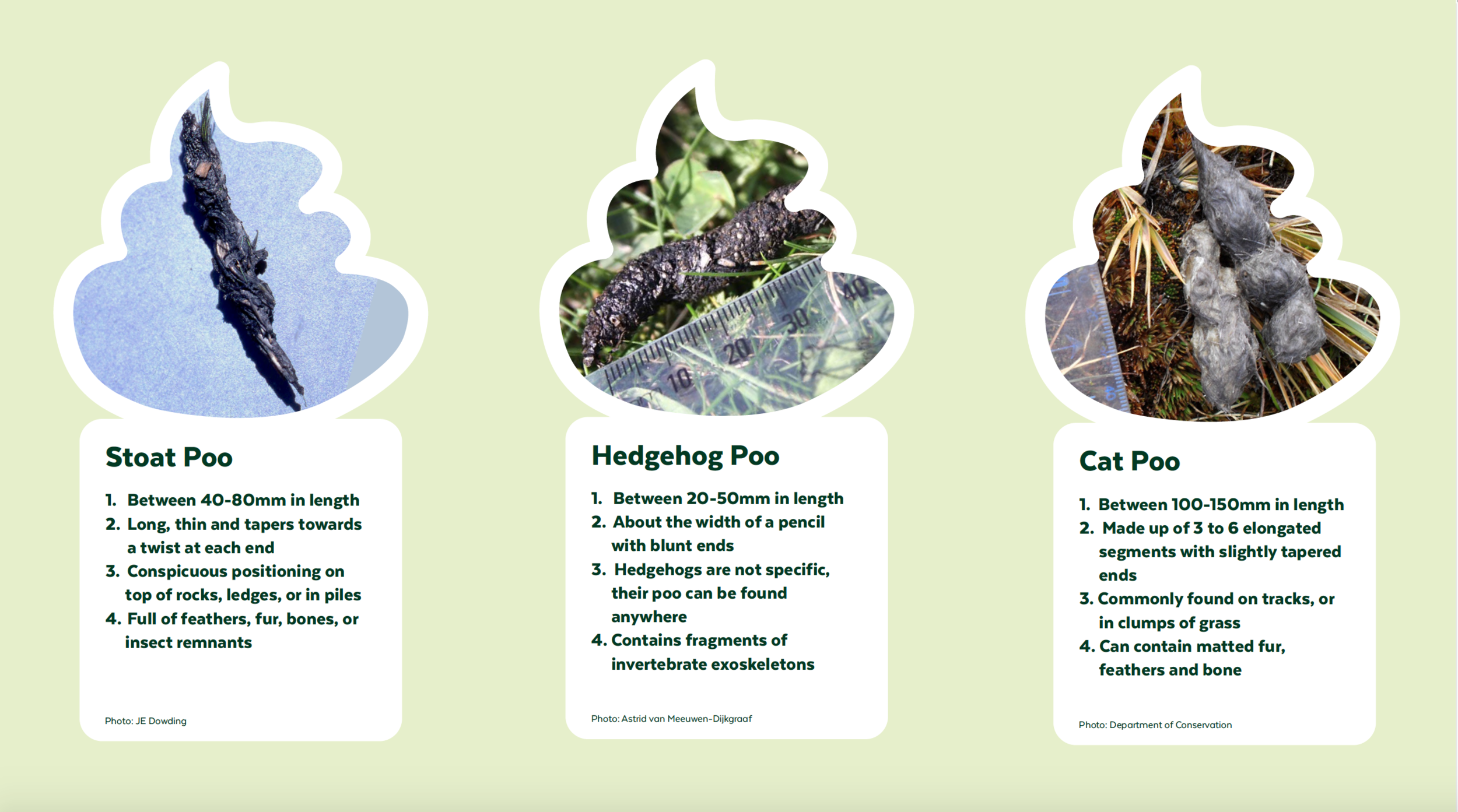 As we head into the spring breeding season, the Te Korowai o Waiheke field team are asking the island community to keep their eyes peeled for something hairy, brown, and long but it’s not stoats they’re talking about, it’s their poo.